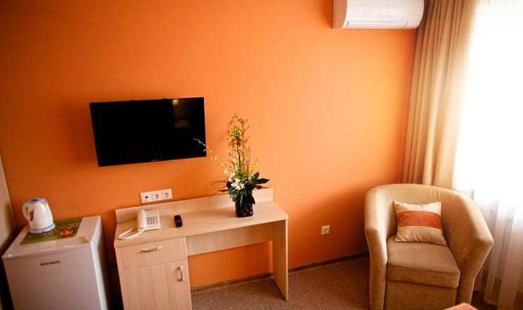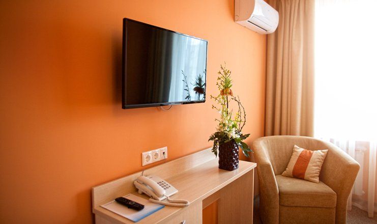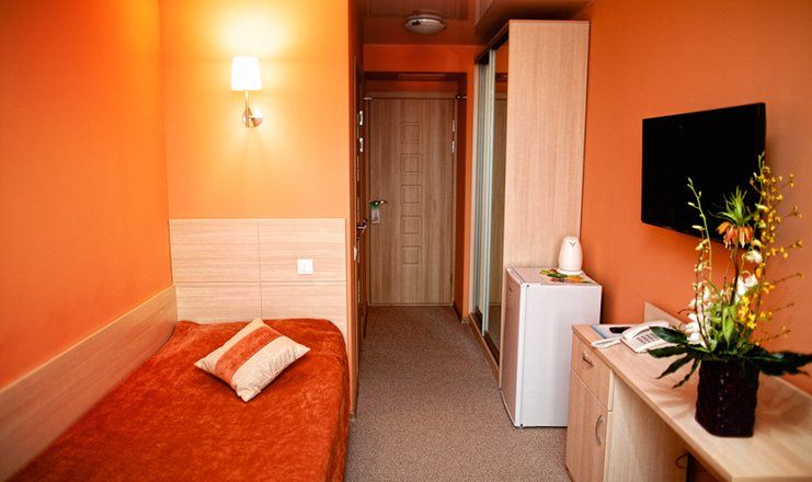 Оснащение номера: односпальная кровать, прикроватная тумбочка, стол, стул, кресло, шкаф для одежды, кондиционер, телевизор, телефон, холодильник