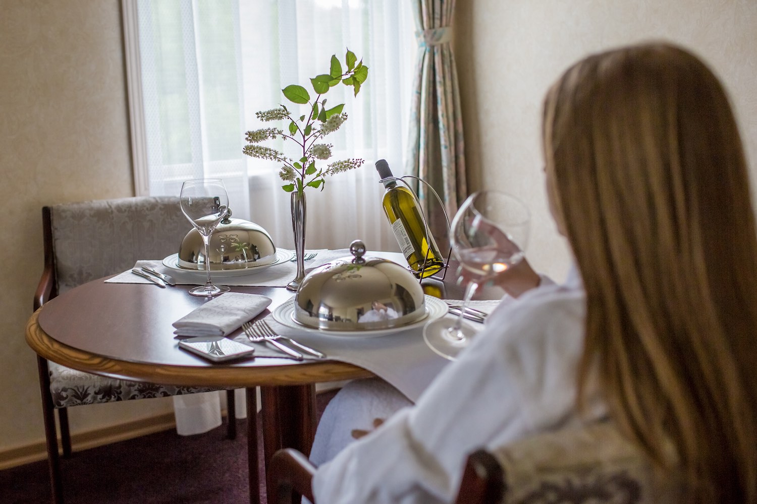В номере: гостиная, мини-кухня, 2 гардероба, двуспальная кровать 210-200 см (производство Япония), 4 пуховые подушки (производство Финляндия), антибактериальное одеяло и льняное белье, мебель из натурального дерева, возможна установка 1 доп. кровати 90 х 190 см