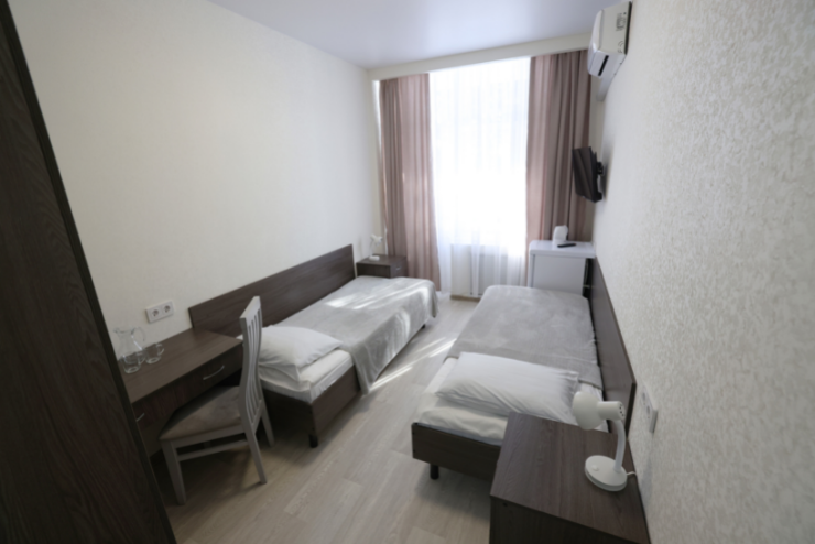 Оснащение номера: две односпальные кровати, прикроватные тумбы, стол, стулья, шкаф для одежды, телевизор, холодильник, электрочайник, бесплатный интернет Wi-Fi