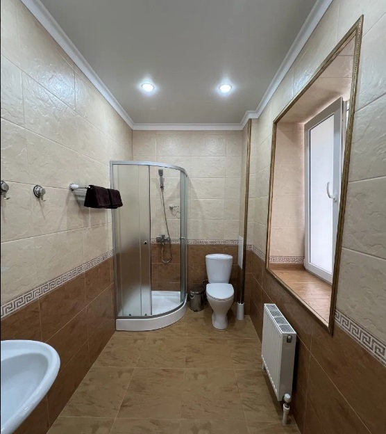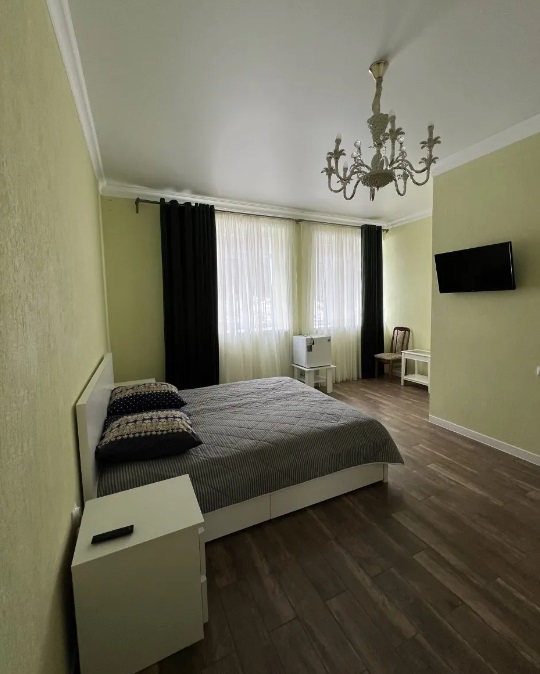 В номере: вешалка, зеркало, кресло-кровать, кровать двуспальная, прикроватные тумбочки, стол, стул, шкаф, телевизор